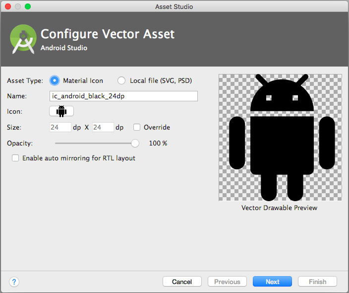 Vector drawable's are based on vector graphics, vector graphics are a way of describing graphical elements using geometric shapes. Android Studio includes a tool called Vector Asset Studio that helps you add material icons and import Scalable Vector Graphic (SVG) and Adobe Photoshop Document (PSD) files into your project as vector drawable resources. Vector Asset Studio adds a vector graphic to the project as an XML file that describes the image. Maintaining one XML file can be easier than updating multiple raster graphics at various resolutions.